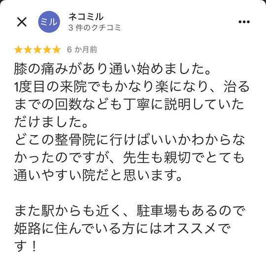 どこの整骨院に行けばいいかわからなかったのですが、先生も親切でとても通いやすい院だと思います。